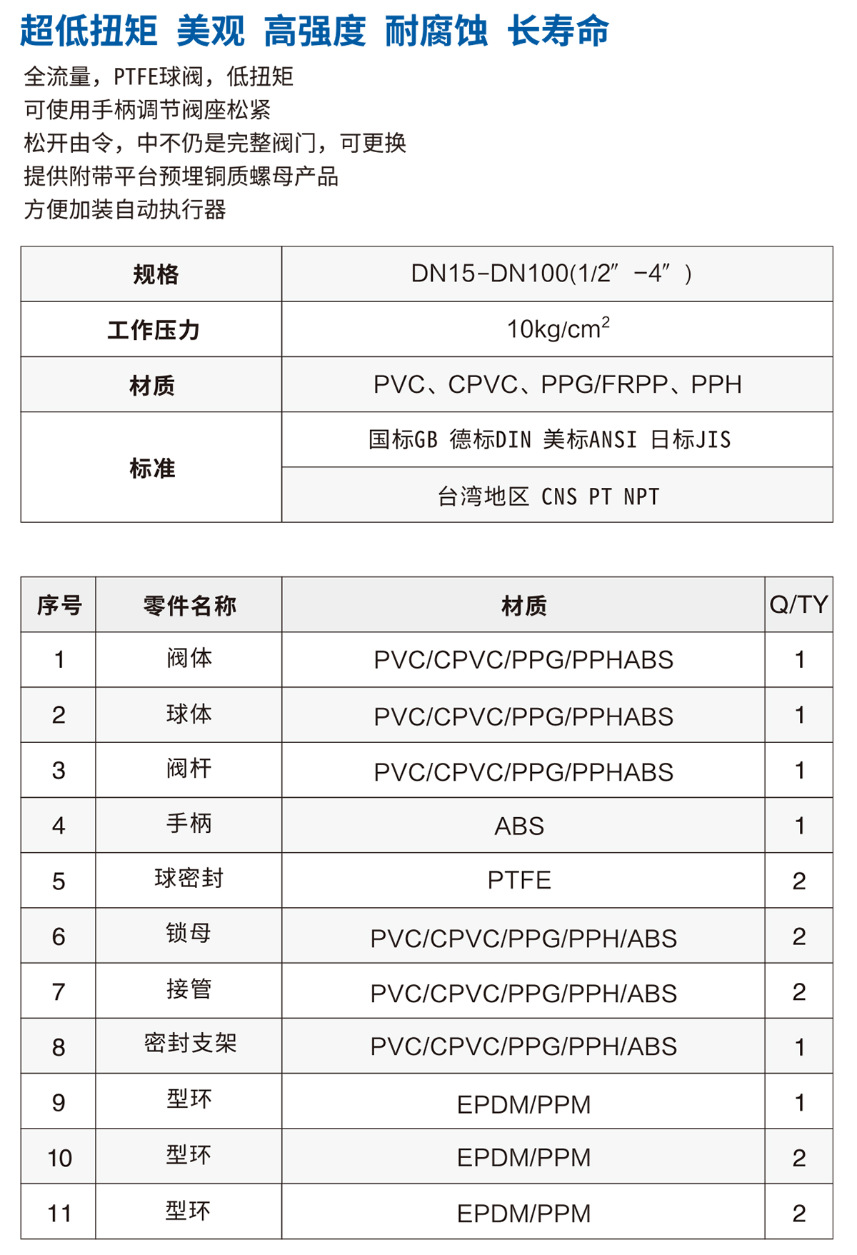 閥體材質(zhì):UPVC、CPVC、PP